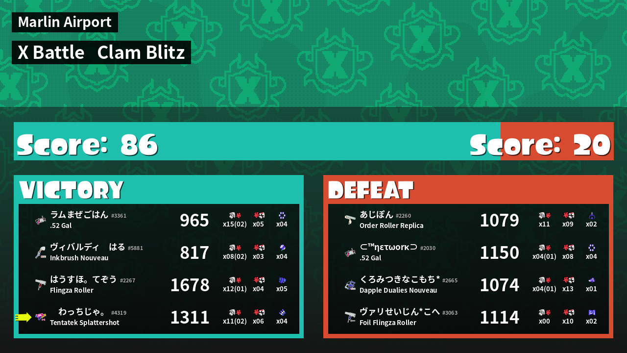 | Medals | #1 Super Jump Spot #1 Splat Assister #1 Clam Stopper | ||