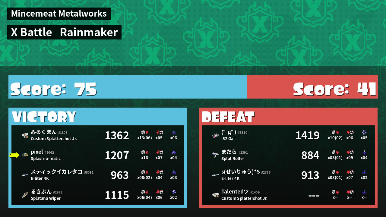 | Medals | #1 Overall Splatter #1 Enemy Splatter #1 Rainmaker Stopper | ||