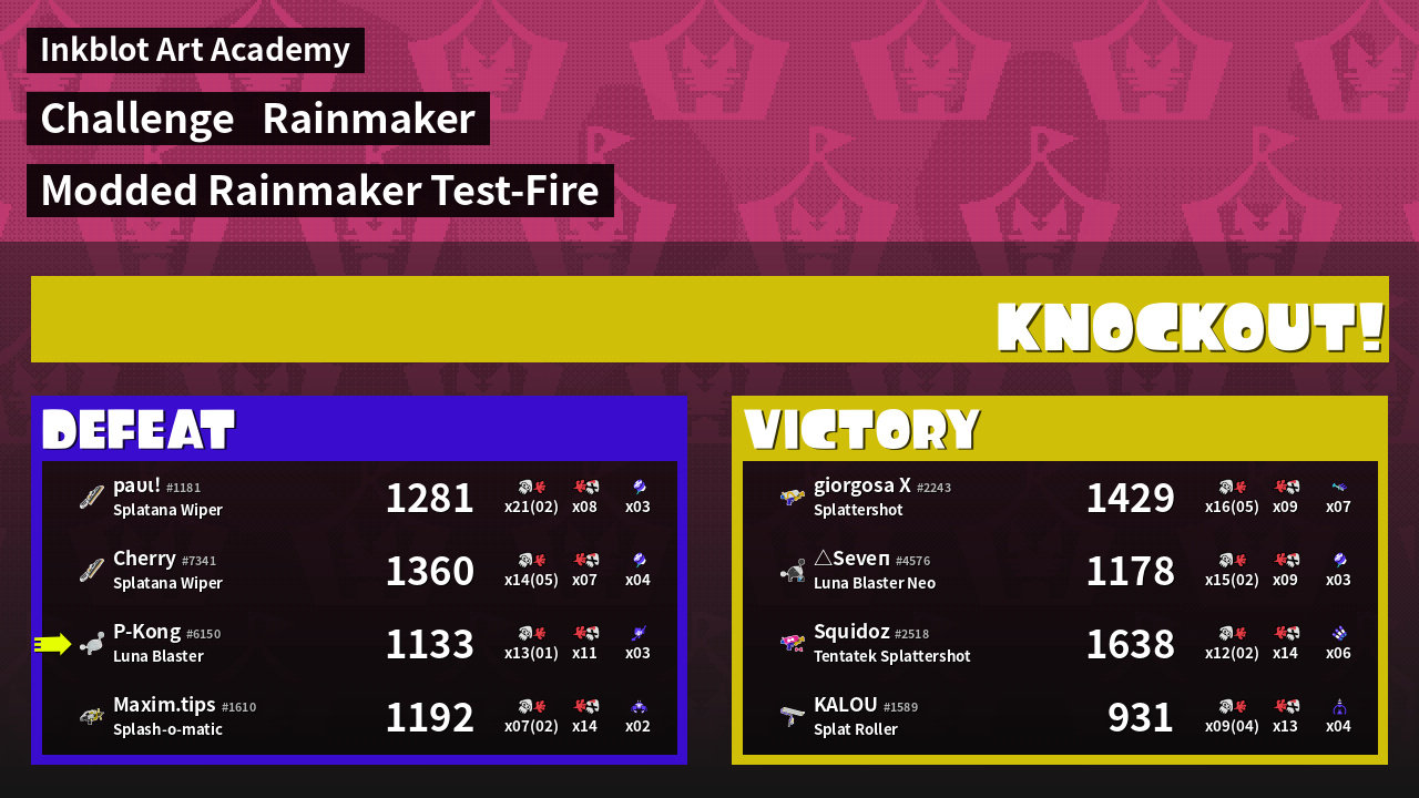| Medals | #1 Rainmaker Stopper #1 Ink Consumer #2 Enemy Splatter | ||
