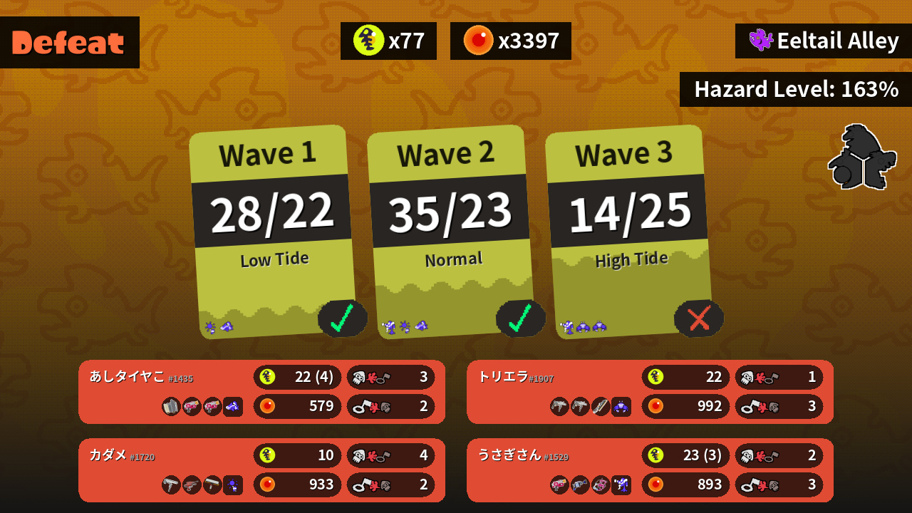 | Weapons | Sloshing Machine Rapid Blaster Rapid Blaster | Rapid Blaster H-3 Nozzlenose Dapple Dualies | Grizzco Roller Grizzco Roller Splatana Wiper | Dynamo Roller Dualie Squelchers Carbon Roller |