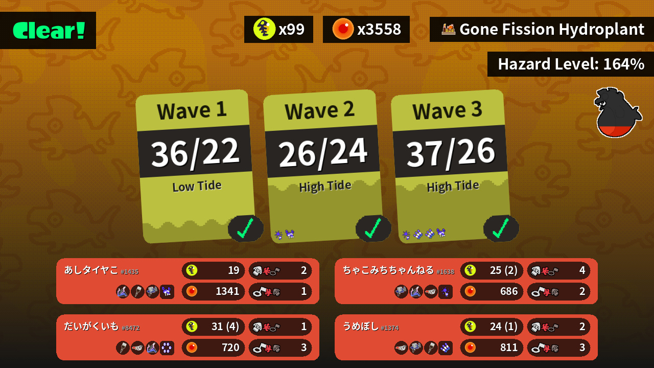 | Weapons | Slosher Octobrush Clash Blaster | Octobrush Goo Tuber Slosher | Clash Blaster Slosher Goo Tuber | Goo Tuber Clash Blaster Octobrush |