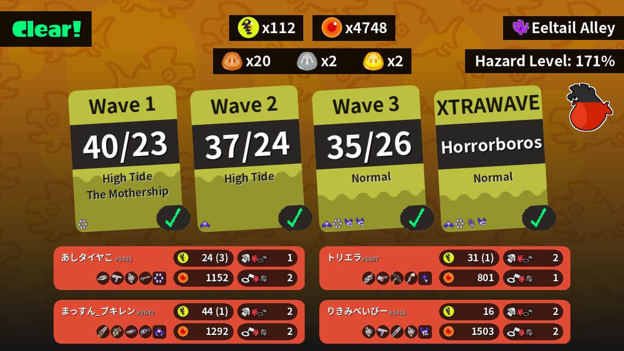 | Weapons | Grizzco Brella Big Swig Roller Tri-Stringer Snipewriter 5H | Grizzco Splatana Douser Dualies FF Splattershot Pro H-3 Nozzlenose | Dark Tetra Dualies Heavy Splatling Undercover Brella Inkbrush | Tri-Stringer Big Swig Roller Splatana Stamper Tri-Stringer |