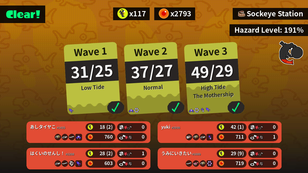 | Weapons | Splash-o-matic Ballpoint Splatling Classic Squiffer | Heavy Edit Splatling Splash-o-matic Ballpoint Splatling | Classic Squiffer Rapid Blaster Pro Splash-o-matic | Ballpoint Splatling Classic Squiffer REEF-LUX 450 |