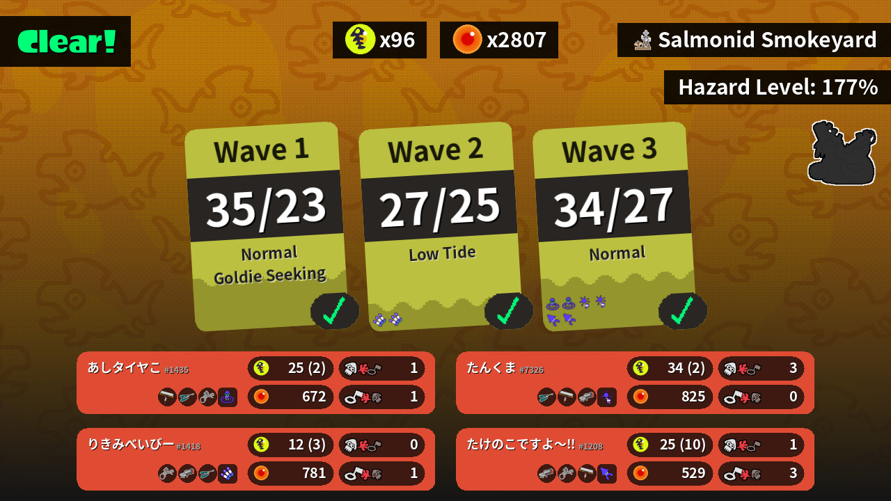 | Weapons | Carbon Roller Jet Squelcher Aerospray MG | Jet Squelcher Carbon Roller S-BLAST '92 | S-BLAST '92 Aerospray MG Carbon Roller | Aerospray MG S-BLAST '92 Jet Squelcher |