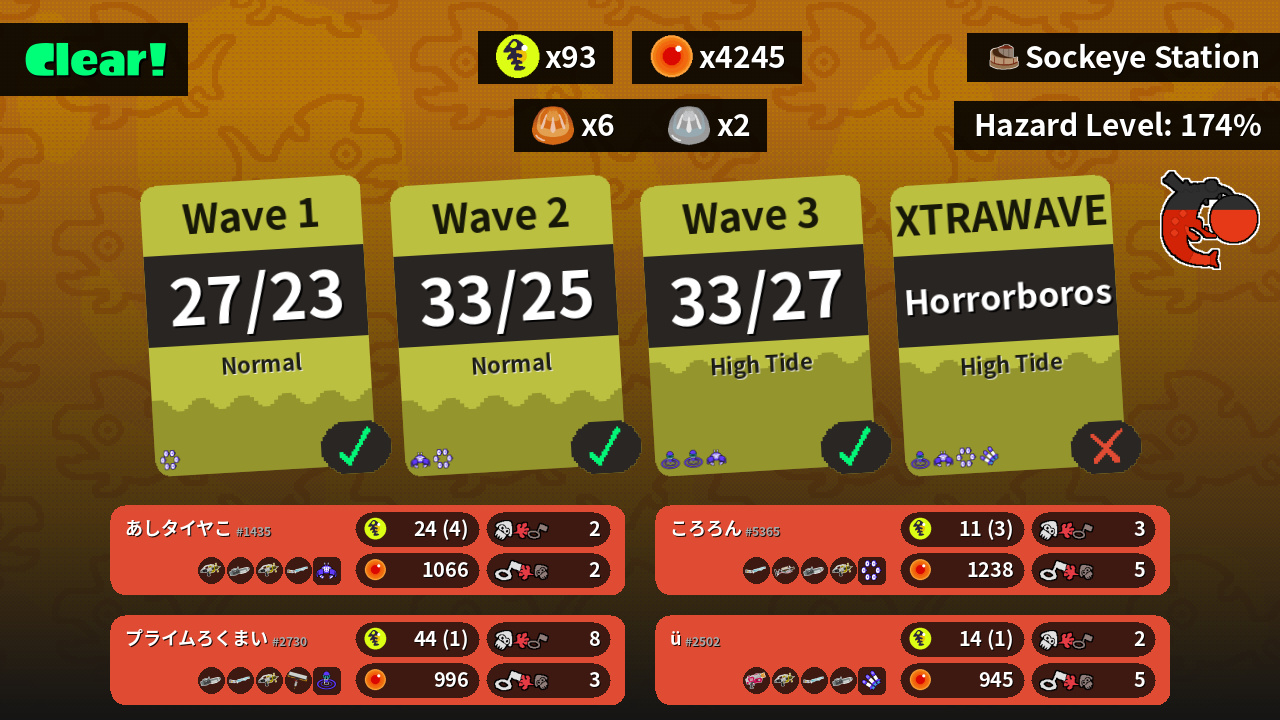 | Weapons | Splash-o-matic Ballpoint Splatling Splash-o-matic Classic Squiffer | Ballpoint Splatling Classic Squiffer Splash-o-matic Carbon Roller | Rapid Blaster Splash-o-matic Classic Squiffer Ballpoint Splatling | Classic Squiffer Grizzco Charger Ballpoint Splatling Splash-o-matic |