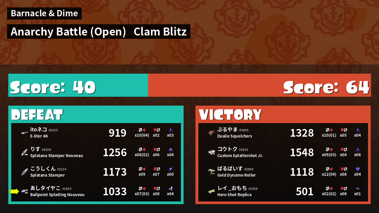 | Mode | Clam Blitz - Anarchy Battle (Open) | ||