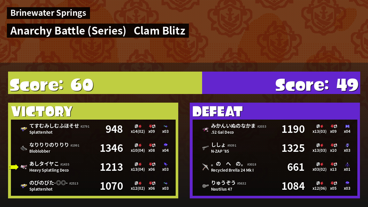| Medals | #1 Super Jump Spot #1 Splat Assister #1 Clam Stopper | ||