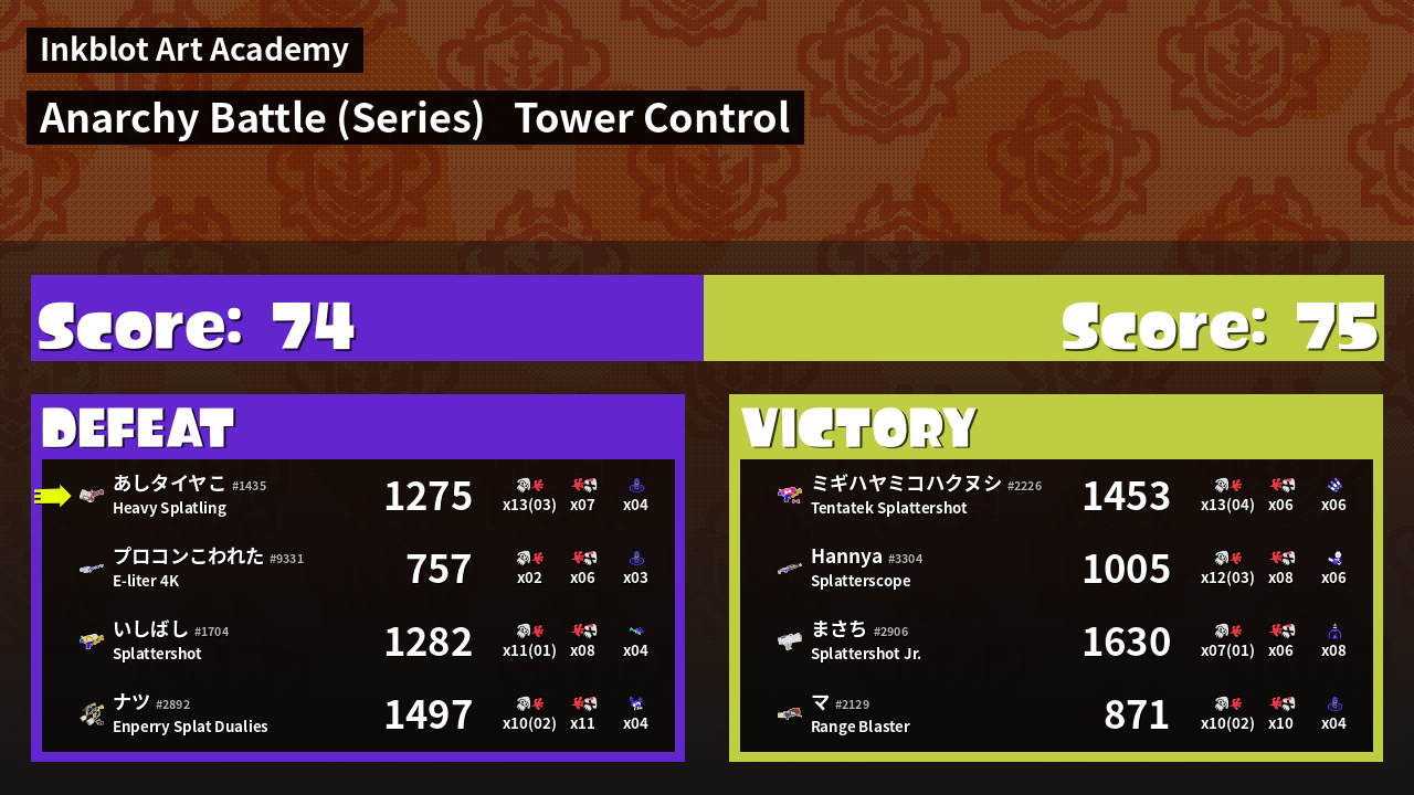 | Medals | #1 Overall Splatter #1 Score Booster Record-Score Setter | ||