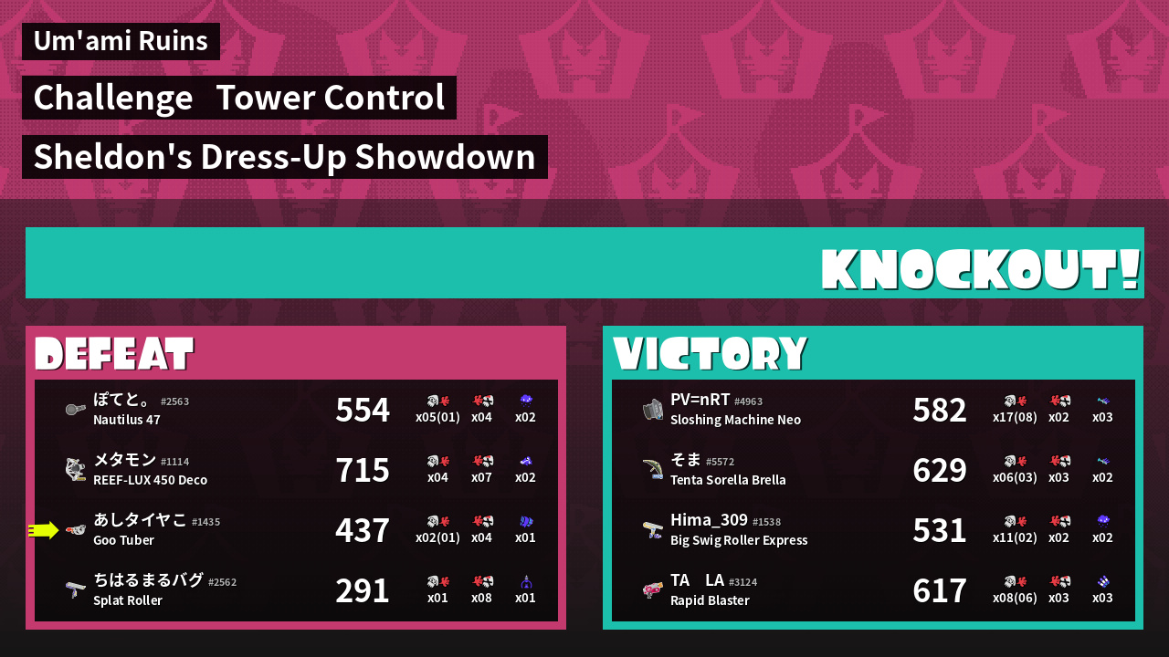 | Medals | #1 Splat Assister #1 Damage Taker #1 Ink Consumer | ||