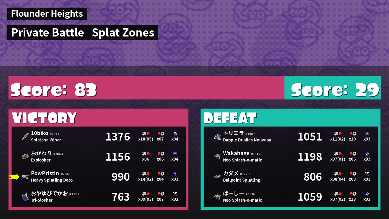 | Mode | Splat Zones - Private Battle | ||