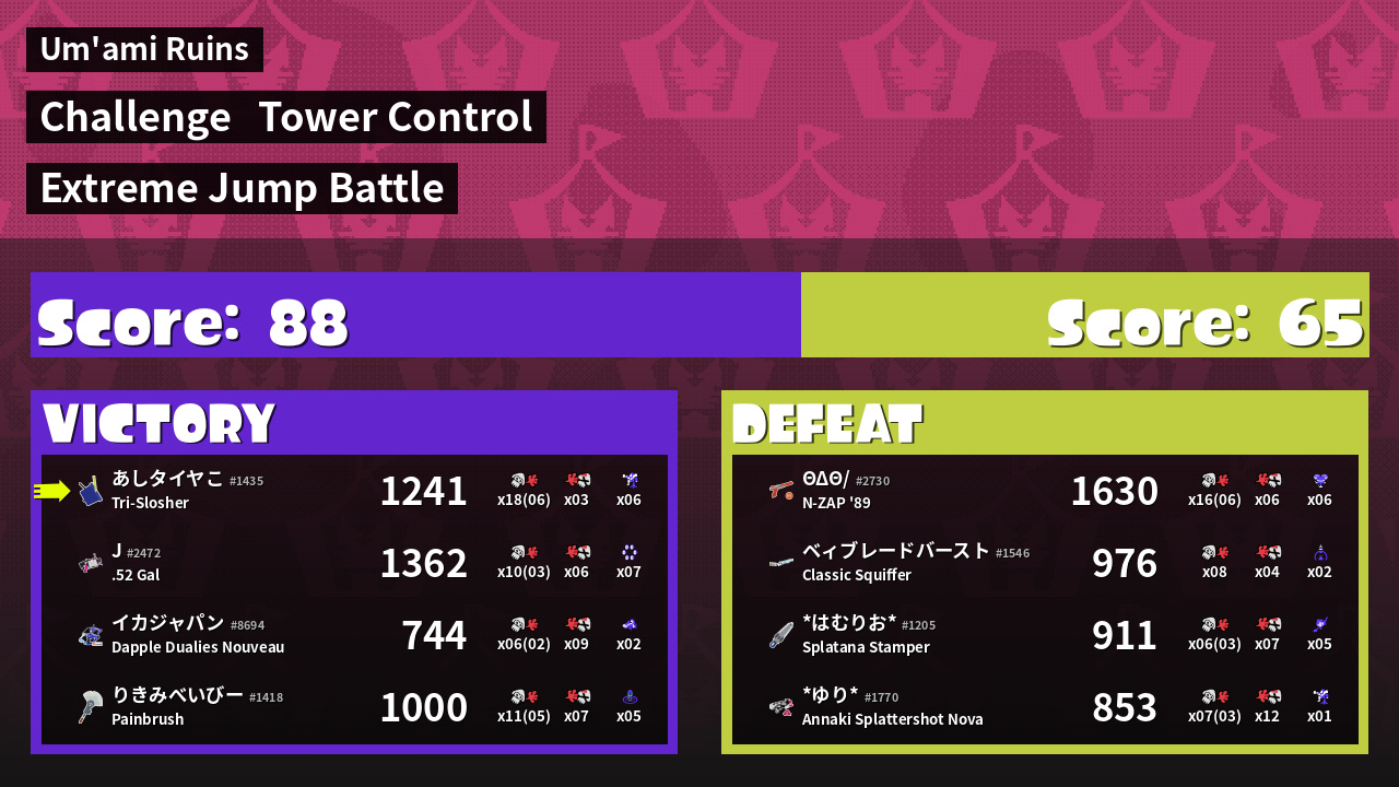 | Medals | #1 Overall Splatter #1 Super Jump Spot #1 Enemy Splatter | ||