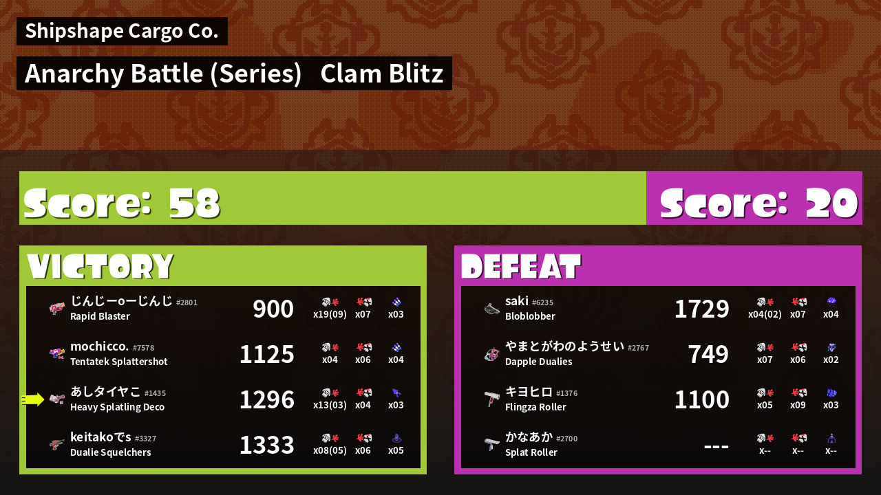 | Medals | #1 Score Booster #1 Enemy Splatter #1 Clam Stopper | ||
