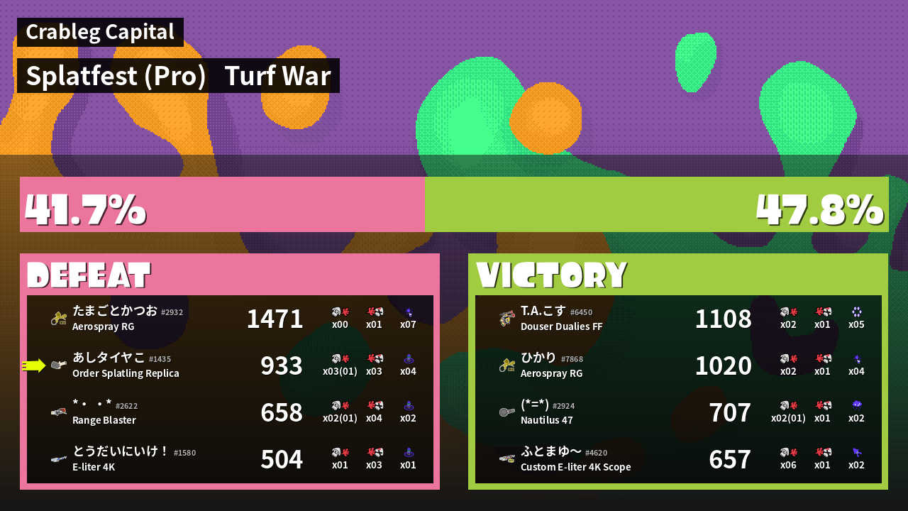 | Medals | #1 Overall Splatter #1 Enemy-Base Inker #1 Enemy Splatter | ||
