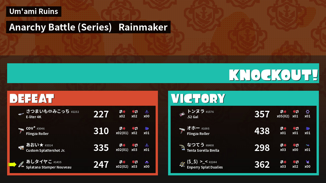 | Medals | #1 Overall Splatter #1 Splat Assister #1 Ground Traveler | ||