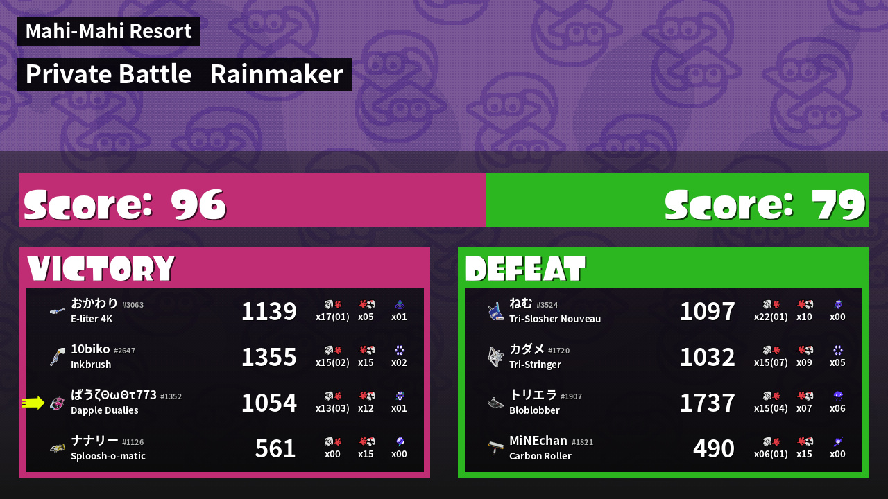 | Medals | #1 Splat Assister #1 Checkpoint Breaker #1 Rainmaker Stopper | ||