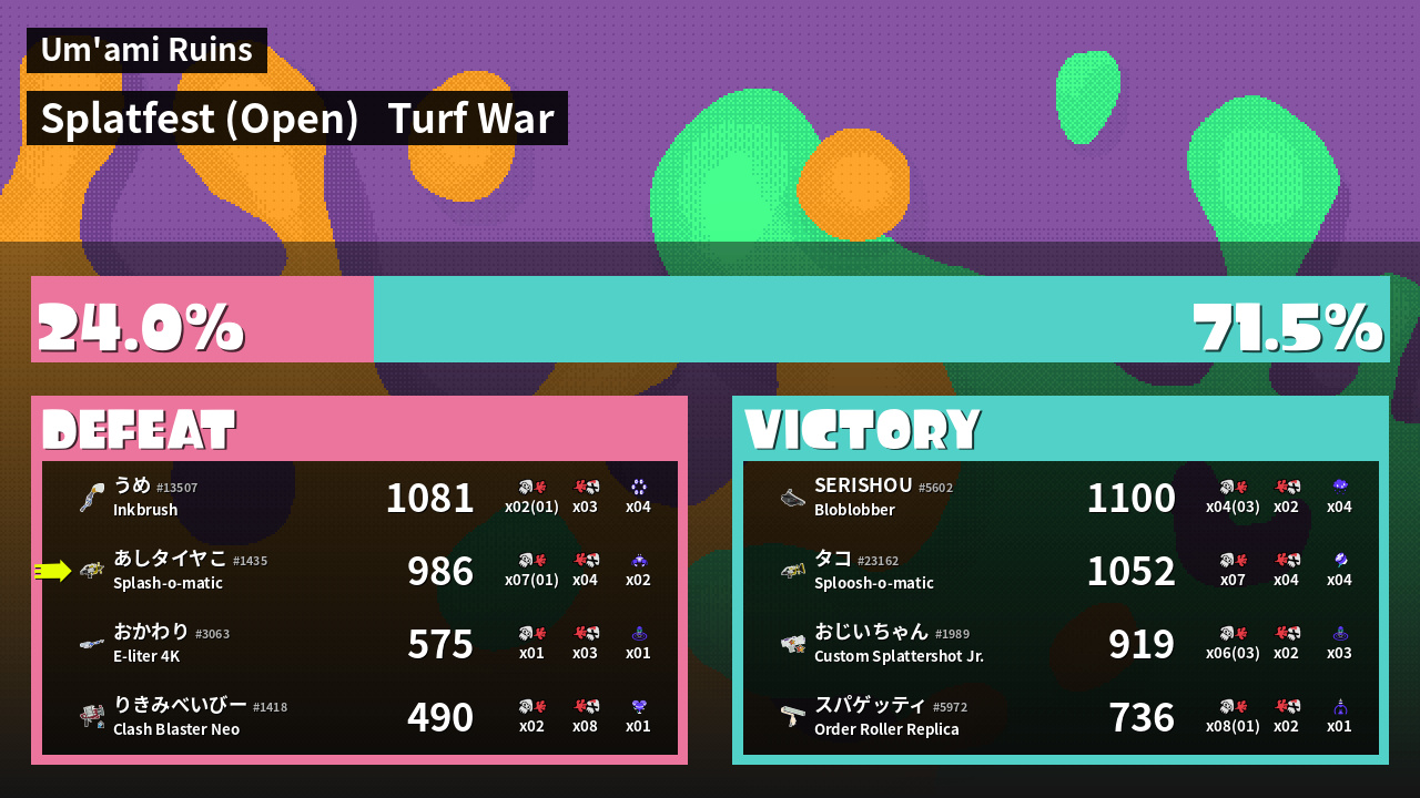 | Medals | #1 Overall Splatter #1 Enemy Splatter #1 Splat Assister | ||
