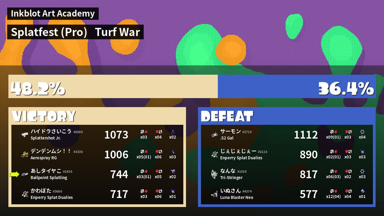 | Medals | #1 Splat Assister #2 Overall Splatter #2 Enemy-Base Inker | ||