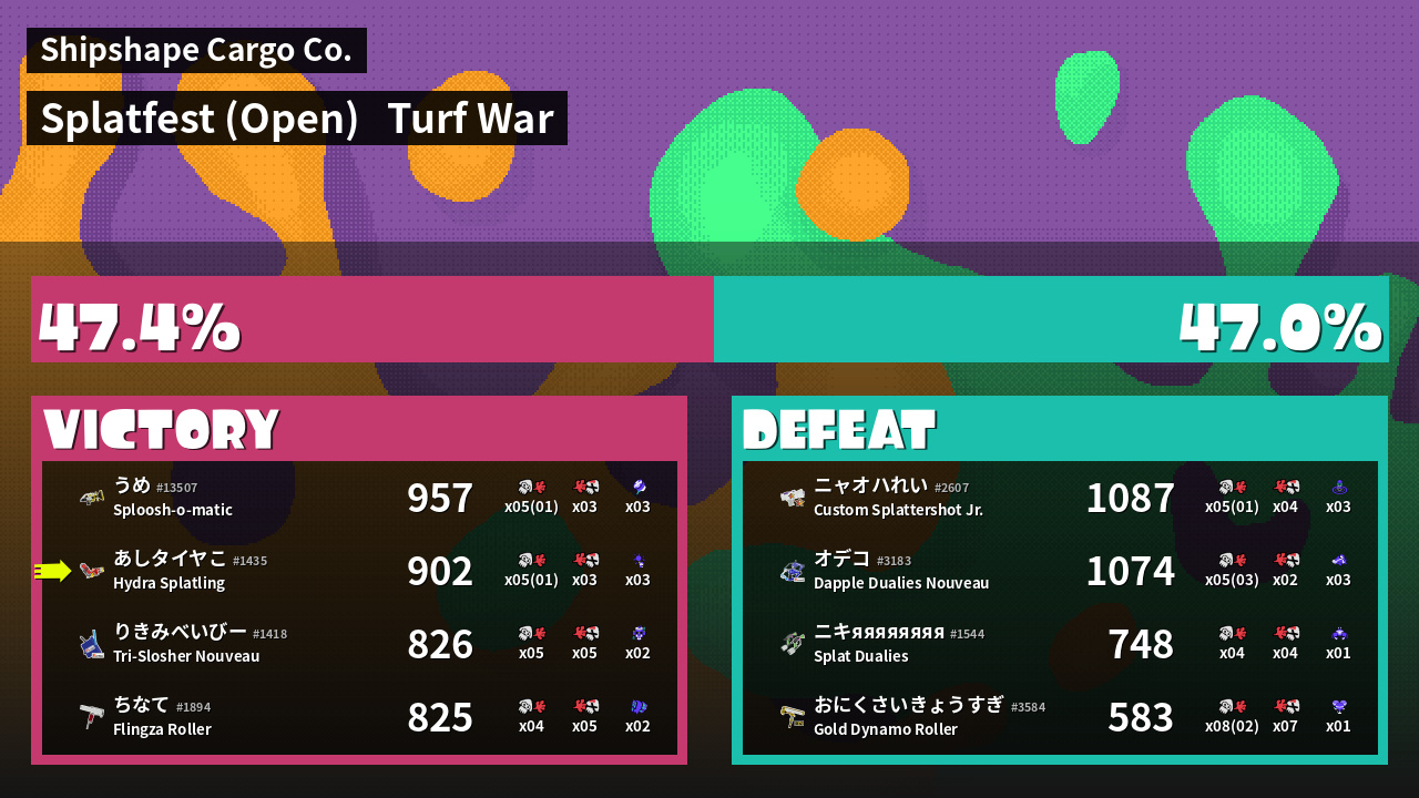 | Medals | #1 Overall Splatter #1 Enemy-Base Inker #1 Splat Assister | ||