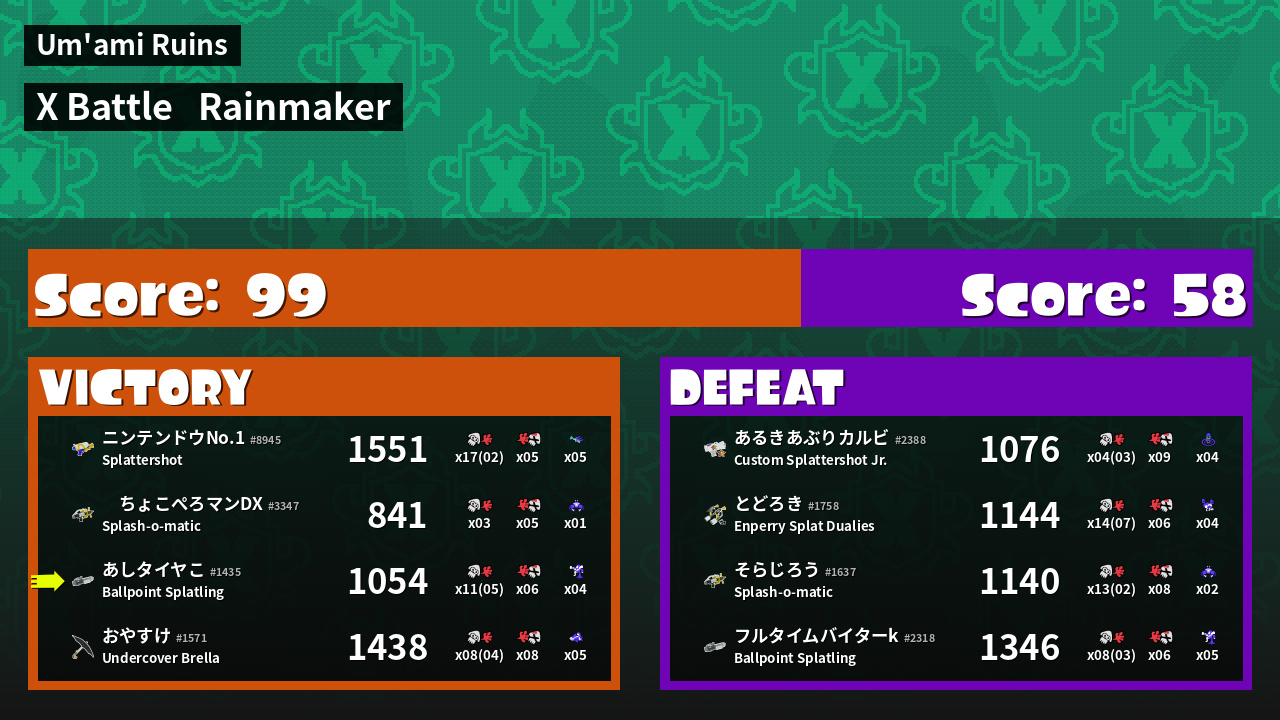 | Medals | #1 Splat Assister #1 Inkjet User #2 Overall Splatter | ||