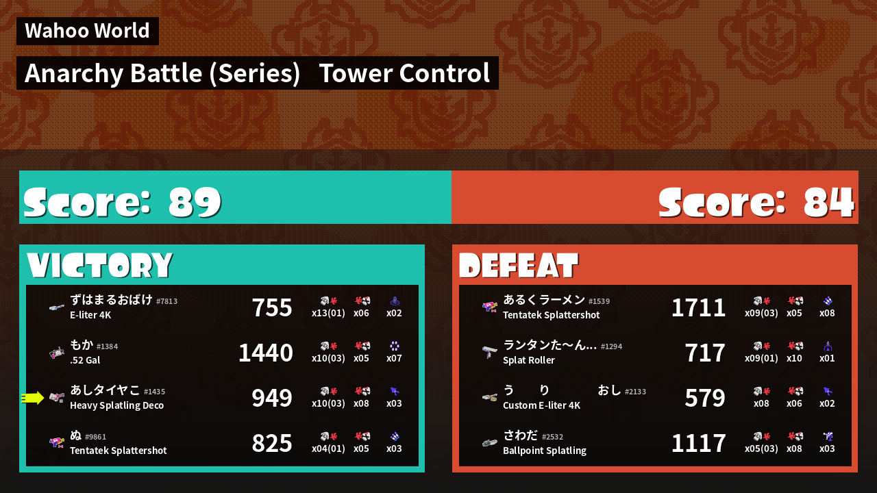 | Medals | Record-Score Setter #1 Splat Assister #1 Tower Stopper | ||
