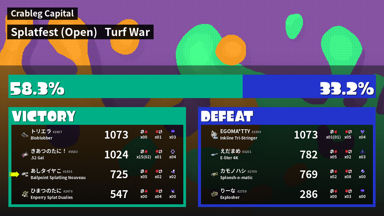 | Medals | #2 Overall Splatter #2 Enemy-Base Inker #2 Enemy Splatter | ||