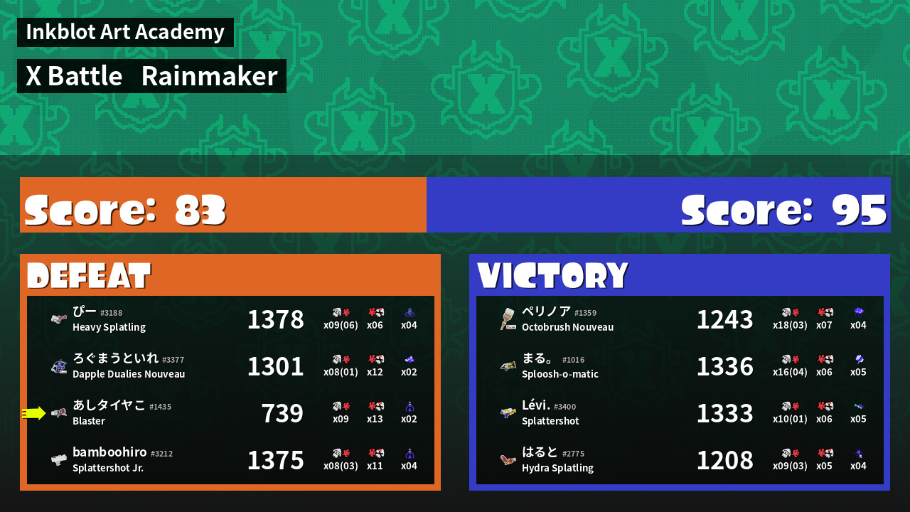 | Medals | #1 Overall Splatter #1 Enemy Splatter #1 Rainmaker Stopper | ||