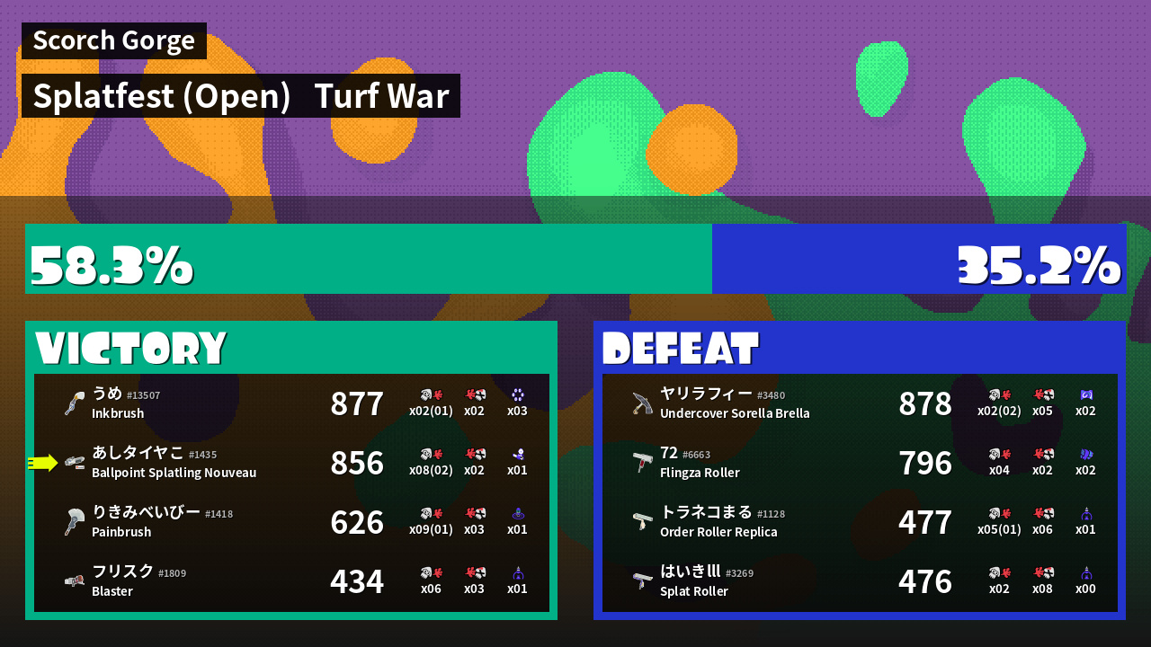 | Medals | #1 Enemy-Base Inker #1 Splat Assister #2 Overall Splatter | ||