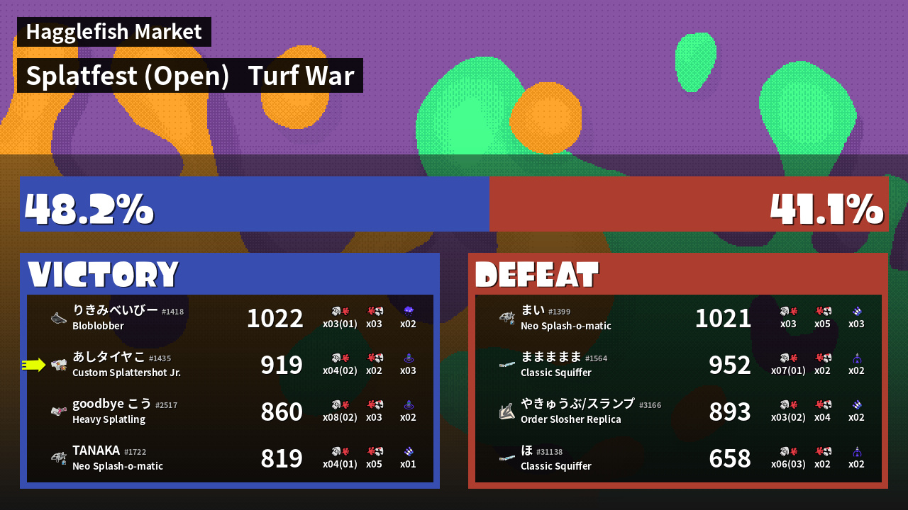 | Medals | #1 Enemy-Base Inker #1 Super Jump Spot #1 Splat Assister | ||