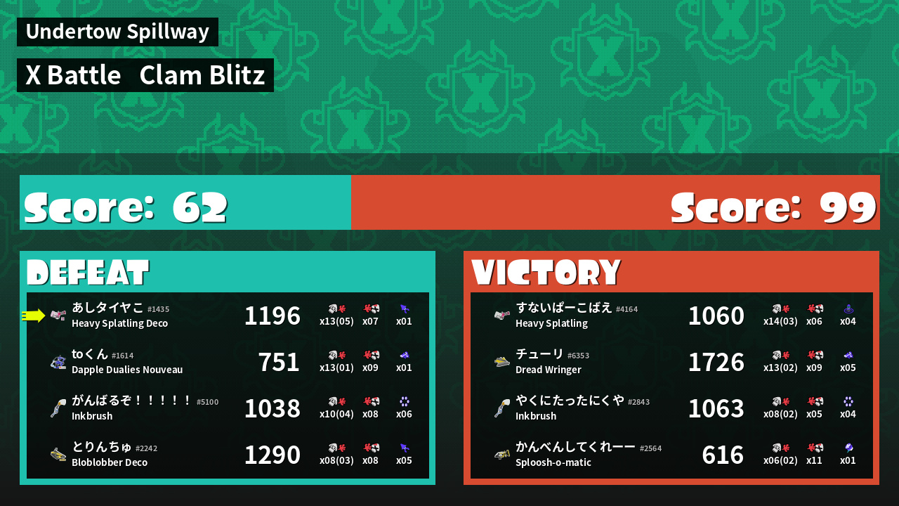 | Medals | #1 Overall Splatter #1 Clam Carrier #1 Super Jump Spot | ||