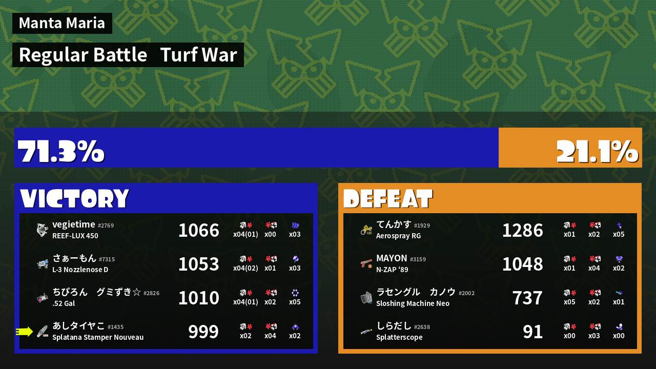 | Medals | #1 Enemy-Base Inker #1 Ground Traveler #1 Damage Taker | ||