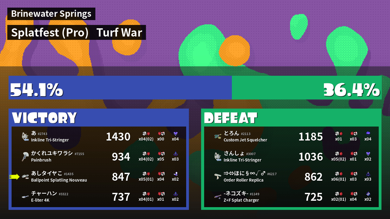 | Medals | #1 Overall Splatter #1 Home-Base Inker #1 Enemy Splatter | ||