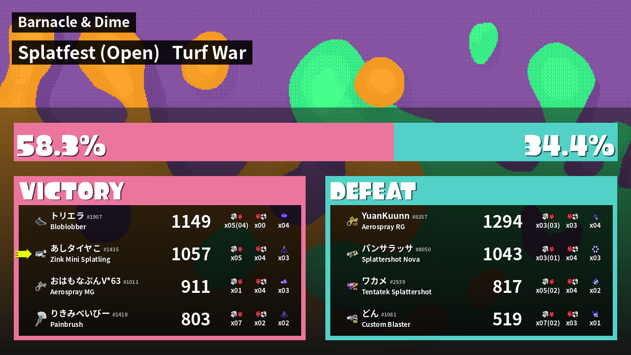 | Medals | #1 Enemy-Base Inker #1 Big Bubbler User #2 Overall Splatter | ||