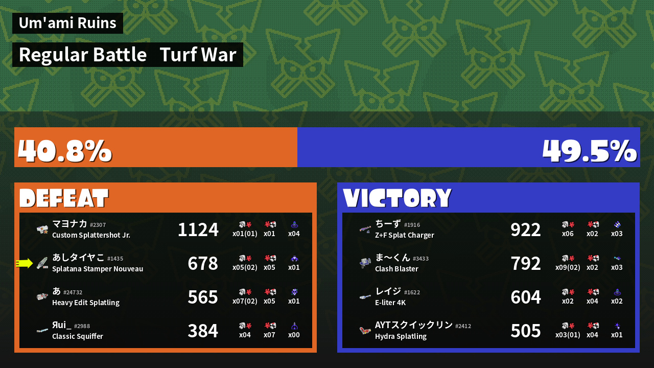 | Medals | #1 Splat Assister #1 Base Defender #1 Damage Taker | ||