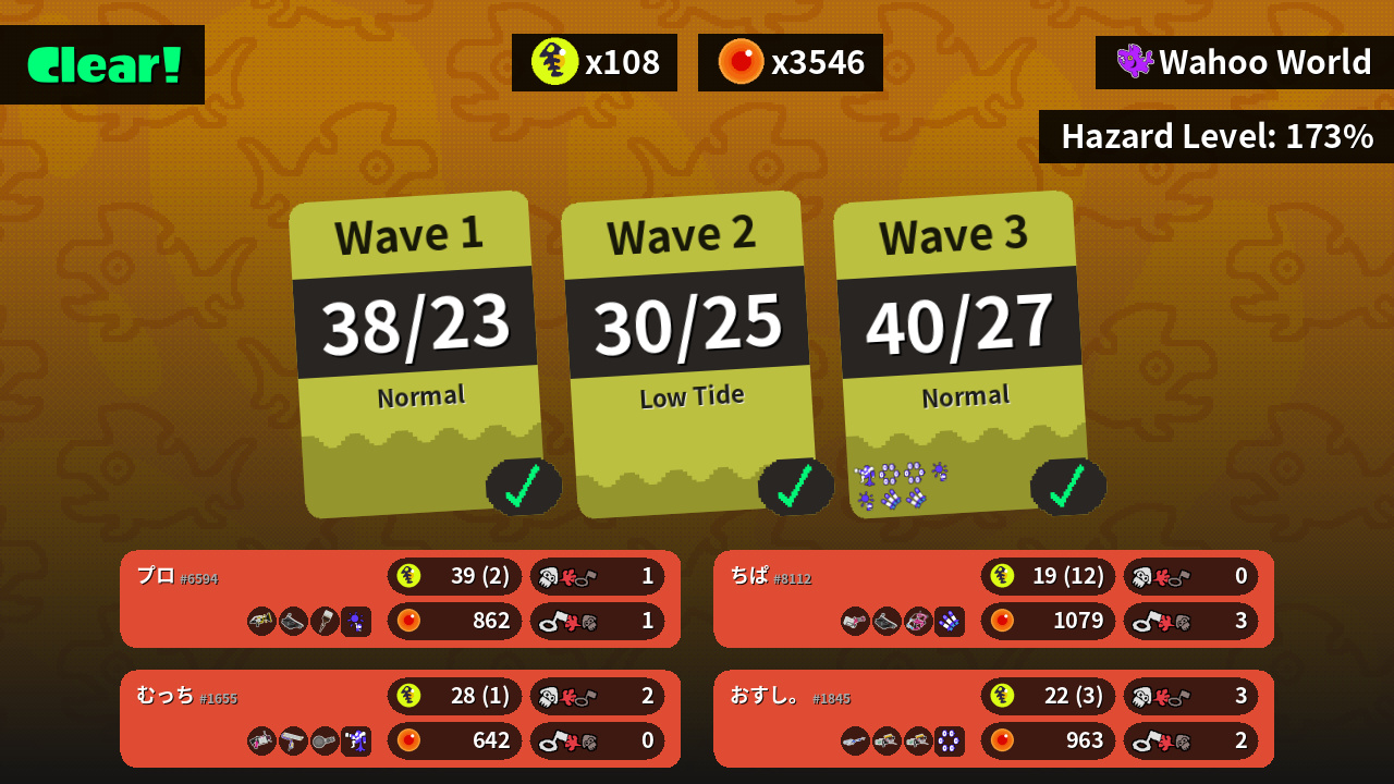 | Weapons | Sploosh-o-matic Bloblobber Octobrush | .52 Gal Splat Roller Nautilus 47 | E-liter 4K Grizzco Blaster Grizzco Blaster | Heavy Splatling Bloblobber Dapple Dualies |