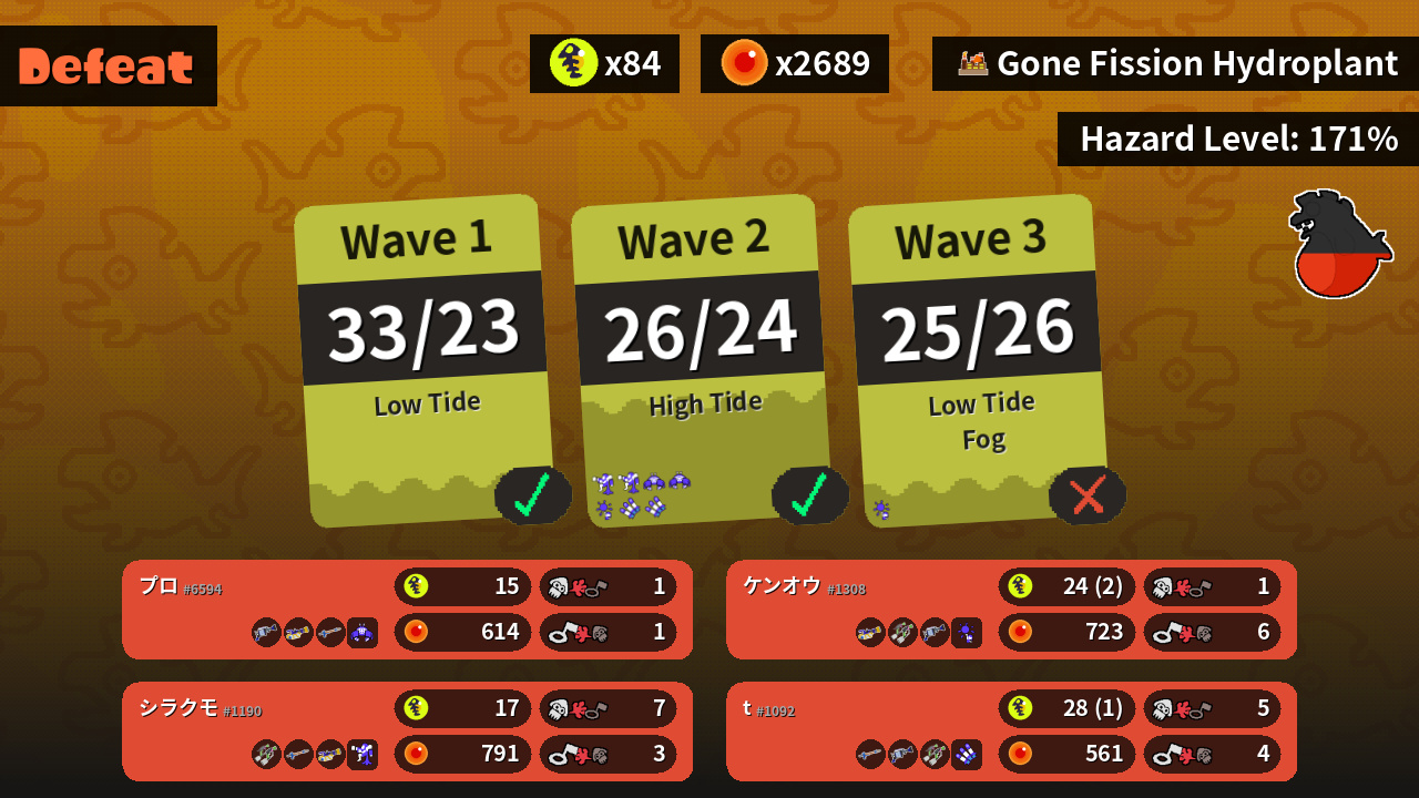| Weapons | H-3 Nozzlenose Mini Splatling Snipewriter 5H | Snipewriter 5H H-3 Nozzlenose Splat Dualies | Mini Splatling Splat Dualies H-3 Nozzlenose | Splat Dualies Snipewriter 5H Mini Splatling |