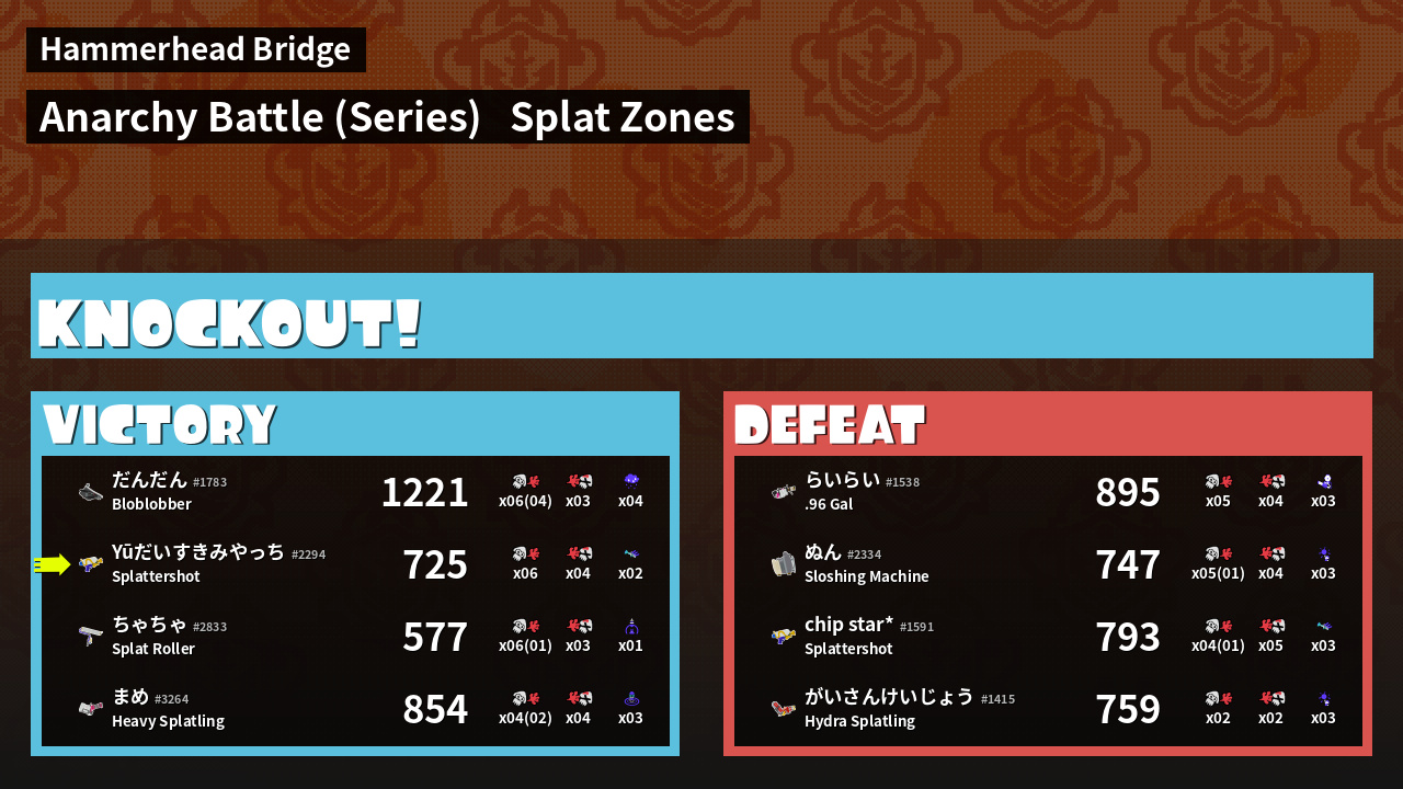 | 私は魚拓 がいさんけいじょう #1415 |  Hydra Splatling     | 759 | 2 + 0 | 2 | 1.00 |  3 | |