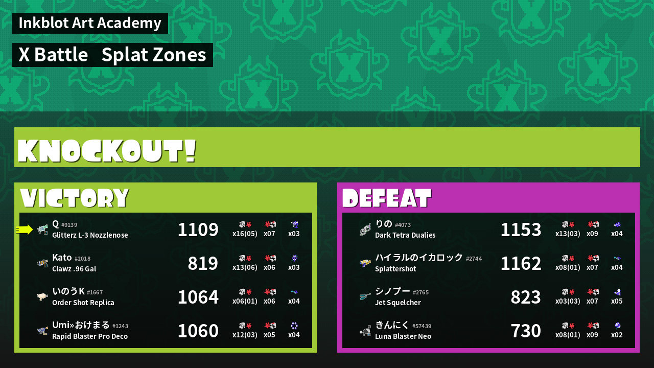 | Medals | #1 Overall Splatter #1 Splat Zone Guard #1 Turf Inker | ||