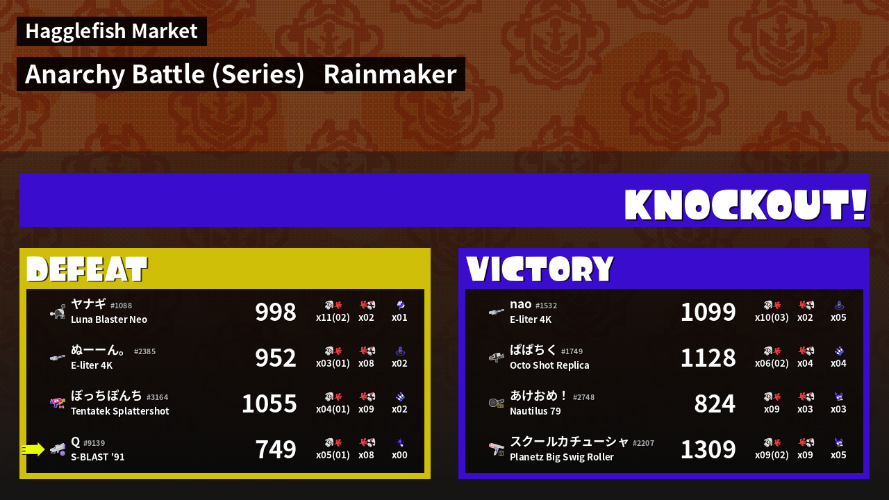 | Medals | #1 Rainmaker Stopper #2 Overall Splatter #2 Super Jump Spot | ||