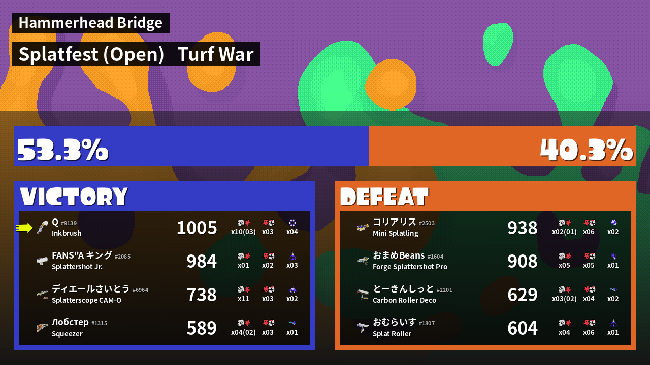 | Medals | #1 Turf Inker #1 Splat Assister #1 Damage Taker | ||