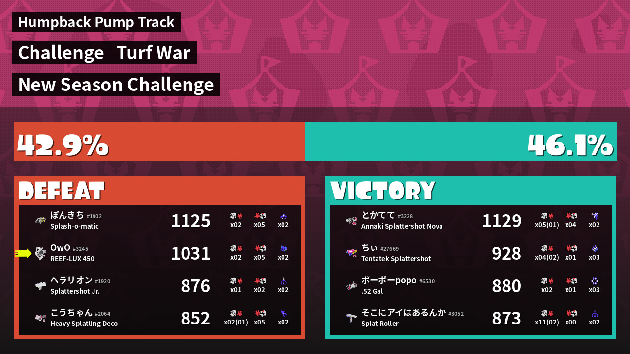| 一箭穿心的貓 とかてて #3228 |  Annaki Splattershot Nova                    | 1,129 | 4 + 1 | 4 | 1.00 |  2 | |
