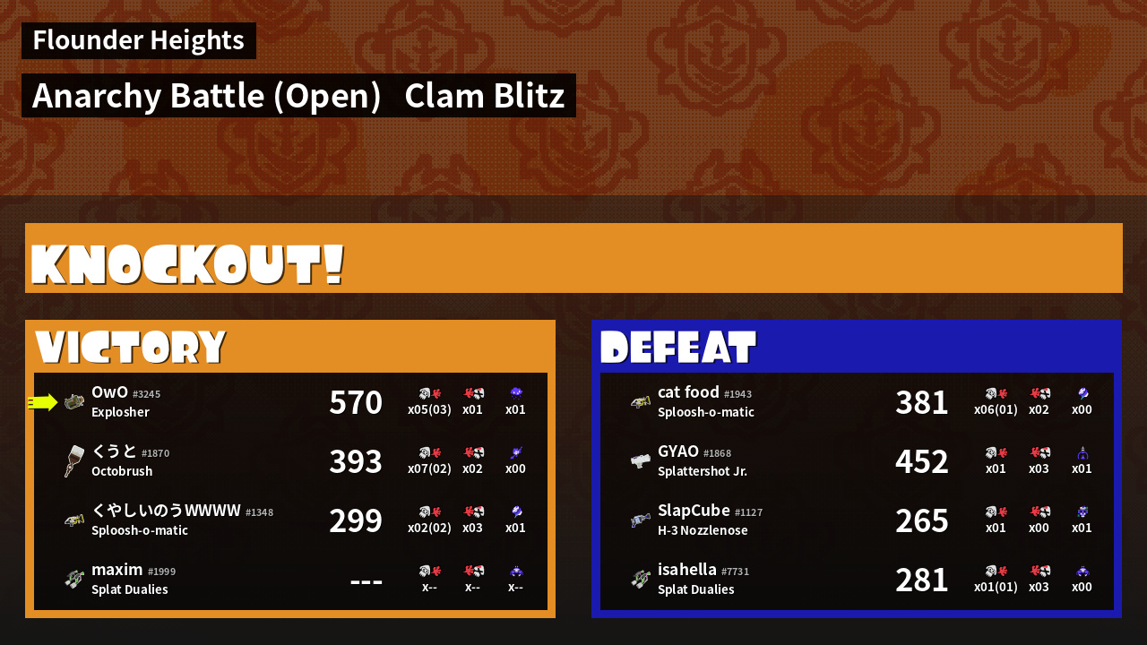 | Mode | Clam Blitz - Anarchy Battle (Open) | ||