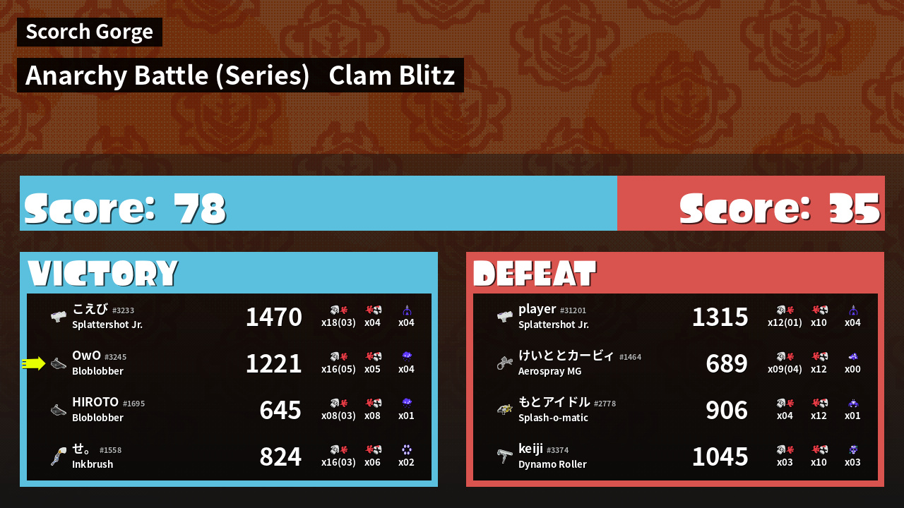 | Medals | #1 Super Jump Spot #1 Splat Assister #1 Clam Stopper | ||
