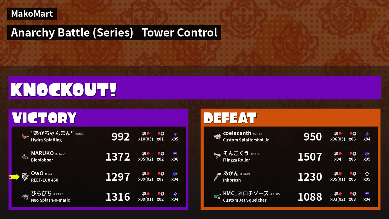 | Name | Weapon | Inked |  k |  d | KR | Sp | |