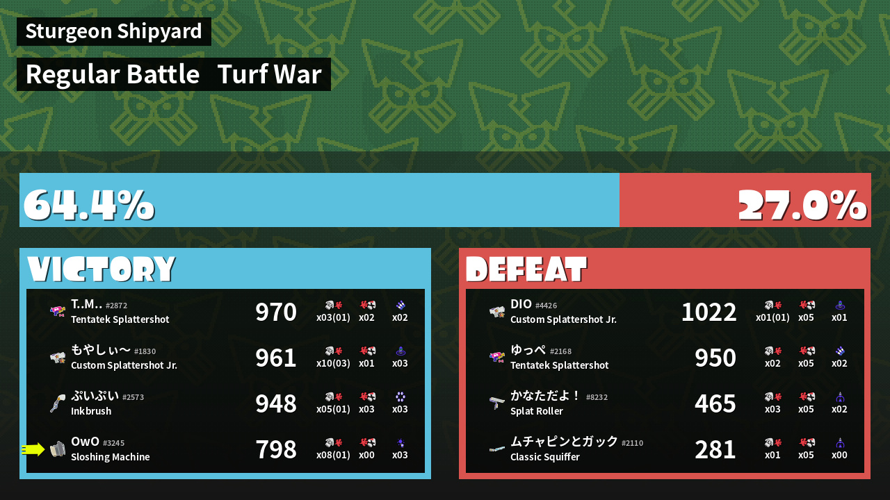 | 果然是烏龜 T..M.. #2872 |  Tentatek Splattershot                    | 970 | 2 + 1 | 2 | 1.00 |  2 | |