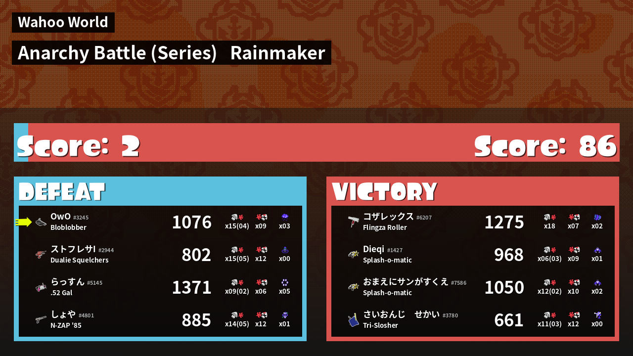 | Medals | #1 Overall Splatter #1 Popular Target #1 Super Jump Spot | ||