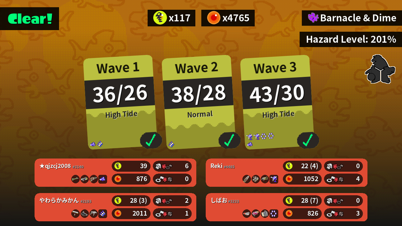 | Weapons | Bamboozler 14 Mk I Splattershot Nova Squeezer | Carbon Roller Bloblobber Grizzco Roller | Goo Tuber Rapid Blaster Sloshing Machine | Grizzco Splatana Grizzco Dualies Sploosh-o-matic |