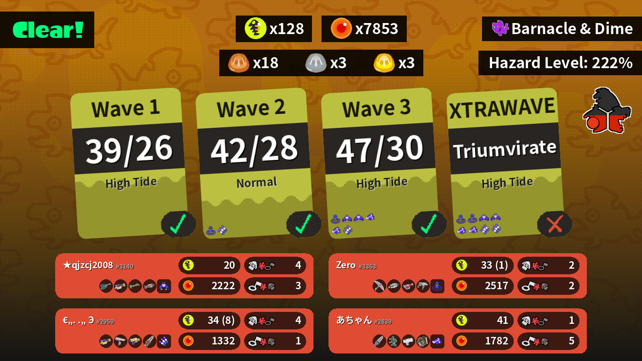 | Weapons | Jet Squelcher Mini Splatling Bamboozler 14 Mk I Grizzco Charger | Splatana Stamper Wellstring V Splattershot Jr. Grizzco Slosher | Mini Splatling Splat Roller Splattershot Grizzco Splatana | Splat Brella Grizzco Brella Rapid Blaster Pro Grizzco Roller |