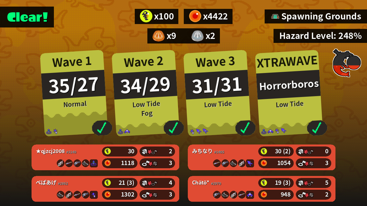 | Weapons | Dark Tetra Dualies Splat Charger H-3 Nozzlenose Bloblobber | Splat Charger H-3 Nozzlenose Bloblobber Dark Tetra Dualies | Bloblobber Dark Tetra Dualies Splat Charger H-3 Nozzlenose | H-3 Nozzlenose Bloblobber Dark Tetra Dualies Splat Charger |