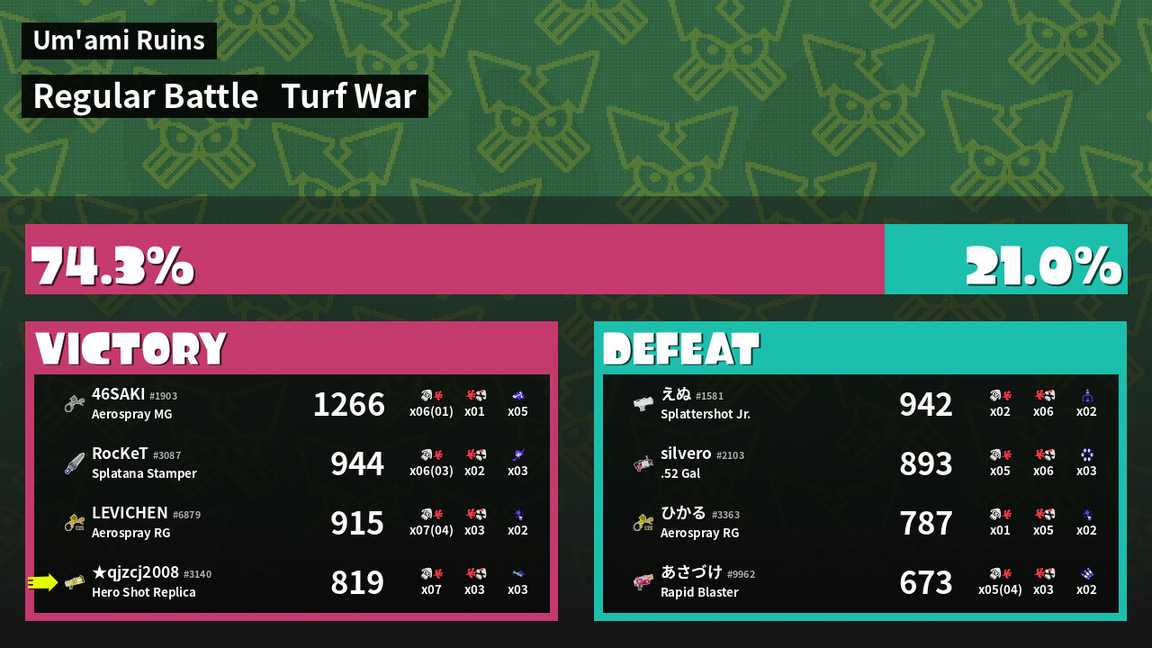 Kills / Deaths | 7 + 0 / 3 > Kill Ratio: 2.33 | ||