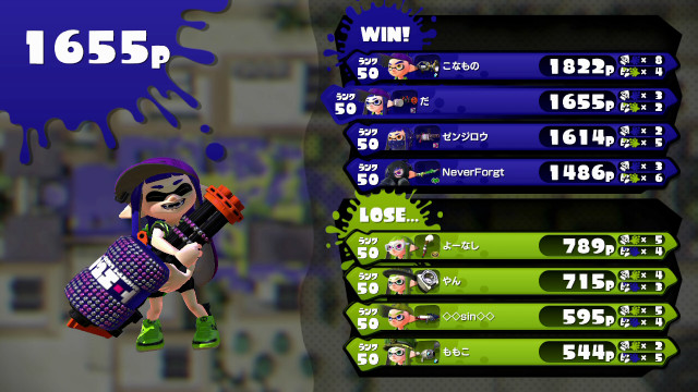 | Splattershot Pro | 50 | 595 | 5 / 4 > | 1.25 | 55.6% | |